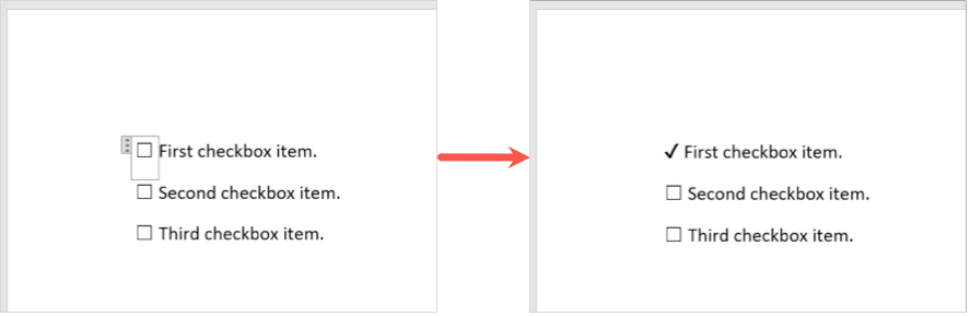 - Place your cursor on the right side of the checkbox and enter a space or use your Tab key for more spacing between the box and your text. Then, type your checkbox item. * Continue the same process to add more checkboxes for a checklist or form.