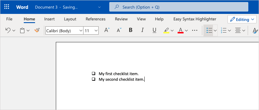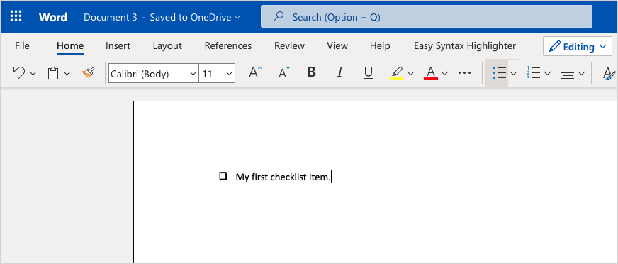 Microsoft Word on the web works a bit differently than its desktop counterparts. You won’t see a form control to add a checkbox. Instead, you can use the bullet list feature.