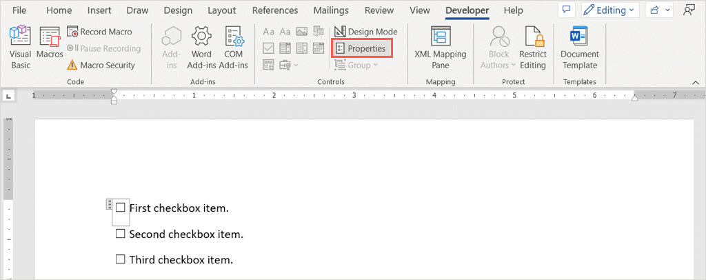 - Select the checkbox, go to the Developer tab, and pick Properties in the Control section of the ribbon.