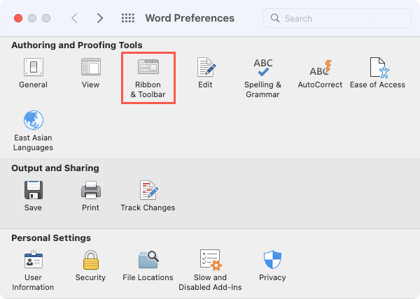 - Select Ribbon & Toolbar.