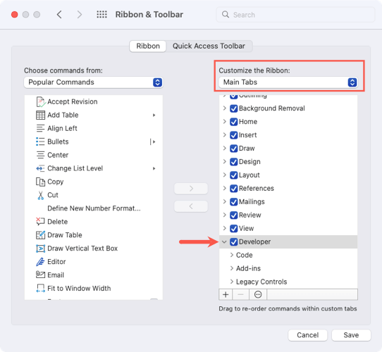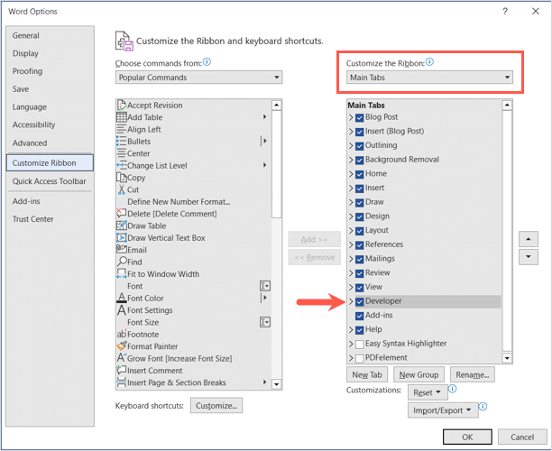 - When the Word Options window appears, choose Customize the Ribbon on the left side. * On the right, select Main Tabs in the Customize the Ribbon drop-down menu. * Check the box for Developer in the list. * Select OK to save your change.