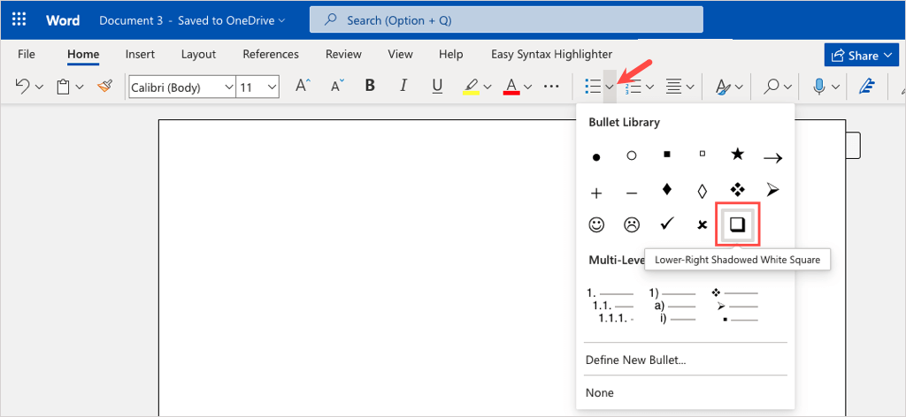 - Go to the Home tab and select the Bullets drop-down arrow.