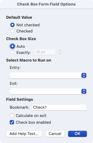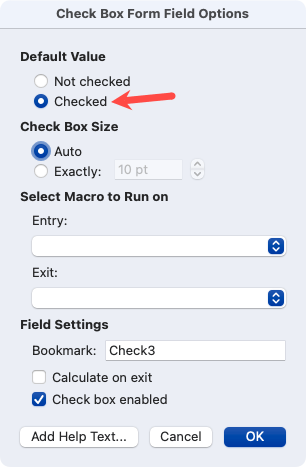 - Use the Default Value section to check or uncheck the box and the Check Box Size section to resize the checkbox. If you want to run a macro on entry or exit, use the drop-down boxes to Select the Macro to Run on. Finally, you can adjust the Field Settings if you like.