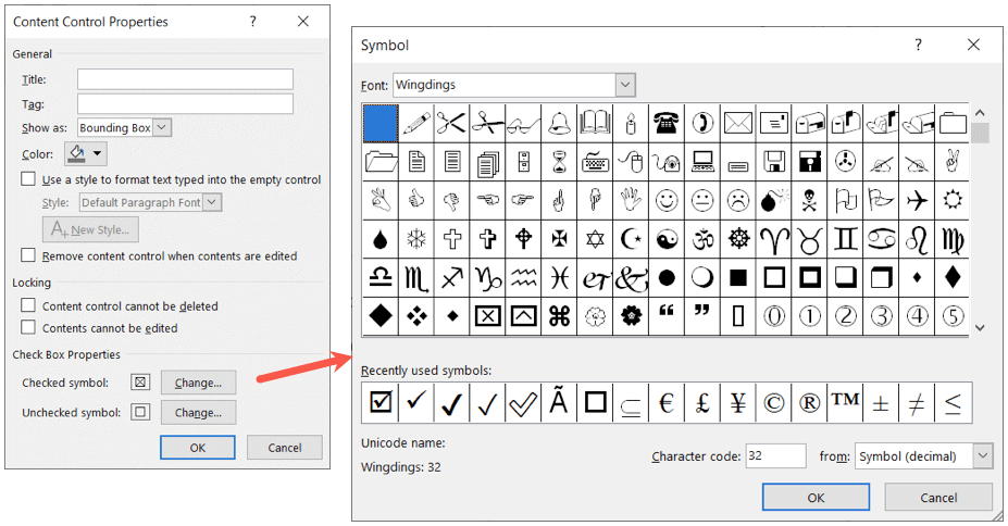 - If you want to change the X symbol used for a checked box, go to the Check Box Properties area at the bottom. Select Change next to Checked symbol and pick the symbol you’d like to use such as a checkmark. Select OK and you’ll see the new symbol appear in the Properties window. You can also change the unchecked symbol if you like.