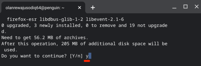 - Terminal will display a prompt notifying you of the app’s download size and disk space that it’ll occupy on your Chromebook. Type y and press Enter to continue.