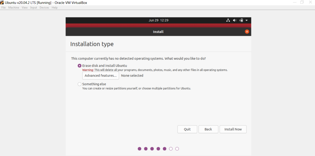 - Keep following the installation wizard’s prompts. You may be asked if you want to **Erase disk and install Ubuntu**. This is normal, just select **Install Now **and move forward.