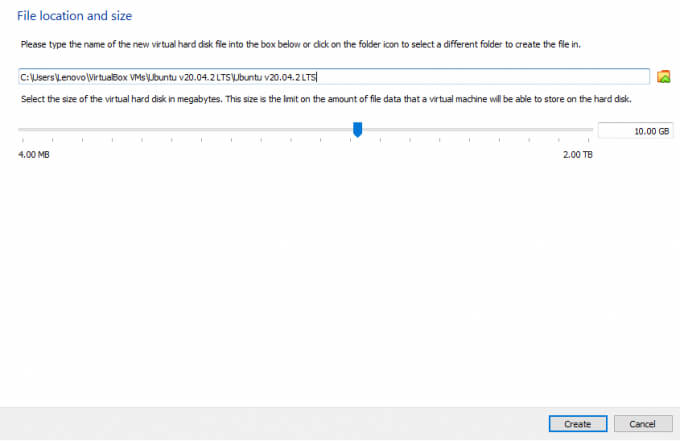 - You’ll see the default VDI storage location and size on the next screen, leave them as they are, and select Create.