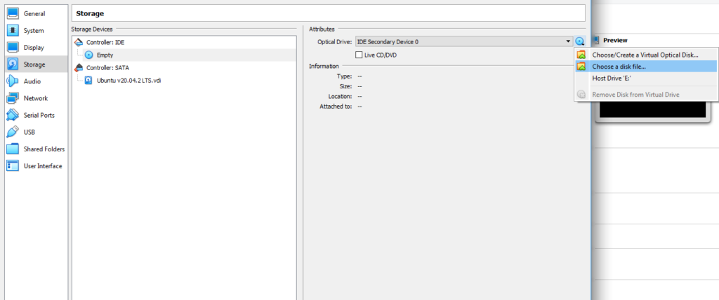Look for Storage on the left sidebar of the Settings dialog box. Click on the tiny disc icon in the Attributes section, select Choose a disk file, navigate to the ISO, and select OK.