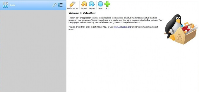 You’ll see the following welcome screen when you launch VirtualBox. Click on New to begin the configuration process.