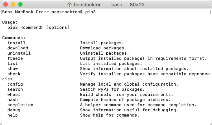 Once it’s installed, type **pip** or **python -m pip** (or **pip3 **or **python3 -m pip**) at the tutorial to run PIP and see a list of available PIP flags.
