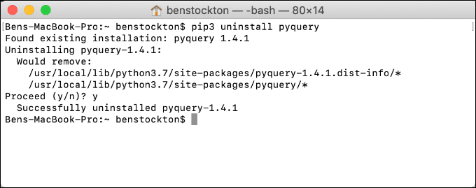 - To remove a package, type pip uninstall package or python -m pip uninstall package, replacing package with the package name. Use **pip3 **or python3 on certain platforms if you have both Python 2.x and 3.x installed. Press y to confirm the uninstallation.