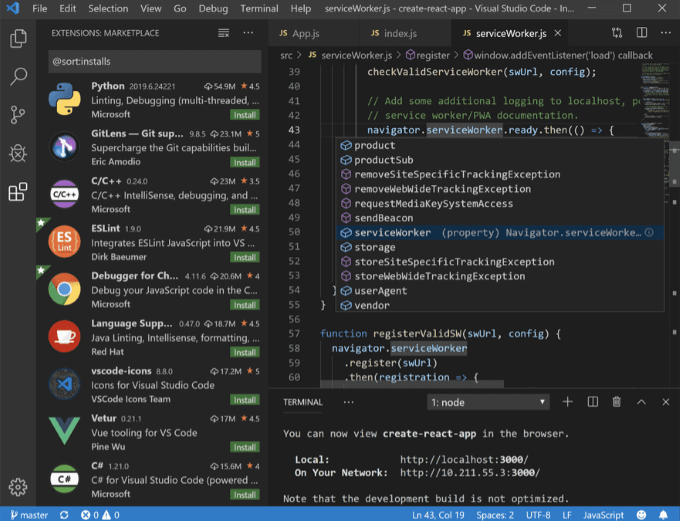 Visual Studio Code is a code editor with many features including debugging, support for Git, and auto-complete for popular languages.