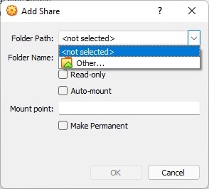 Then, under Folder Path, choose Other and then browse for and select the folder on the host computer that you want to share with the virtual machine. Be sure to choose Auto-mount so that the folder is automatically assigned a drive letter in the guest system.