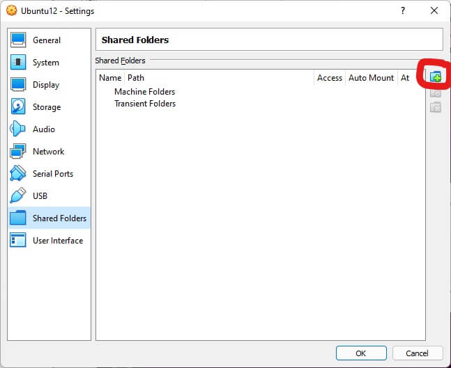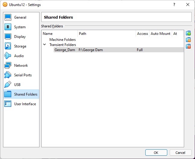 When you’re done, select OK, and you should see your shared folder listed under transient folders. Remember, we’re just testing whether the guest additions are working properly; you can always go back and make your shared folder permanent.