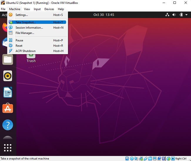 You can take a snapshot in one of two ways. The first is to press the host key + T. By default; the right Ctrl key is the host key unless someone has changed this in the settings. The current host key is displayed in the bottom right corner of the virtual machine window. Alternatively, simply use Machine > Take Snapshot.