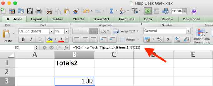 - In the second file (Help Desk Geek), choose a cell and type an **equal symbol **(=).