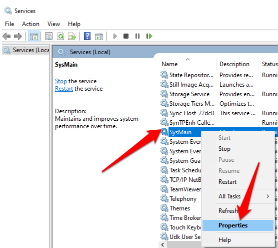- Scroll down to **Sysmain** in the **Services** window, right-click on it and select **Properties**.