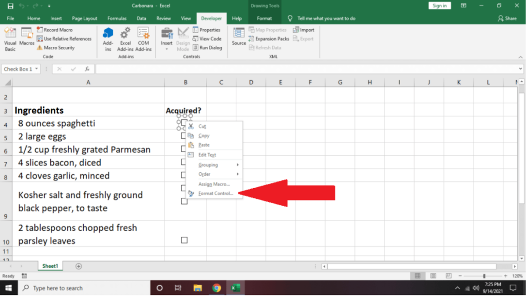 - Right-click a checkbox and select Format Control.