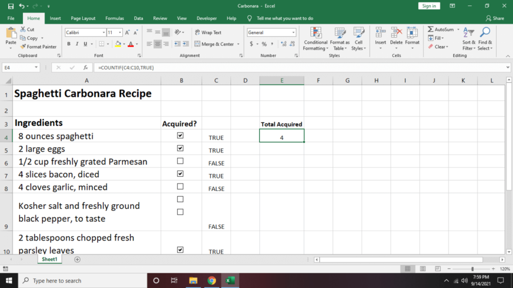 - To get a summary of how many boxes were ticked, click a cell where you want the results displayed. Then, type =COUNTIF(C4:C10,TRUE). Replace C4:C10 with the beginning and ending cells of cell range.