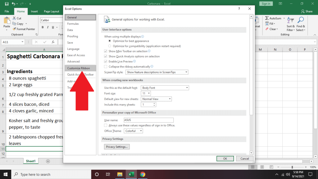 - Scroll down and click Options. Then, click Customize Ribbon.