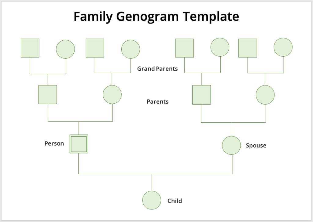 If you’d like a quick start to your genogram, you can start with a Word template. While there are many options, not all templates use the traditional genogram symbols. For a few suggestions, the genogram templates below are available for Microsoft Word for free and provide the conventional symbols.