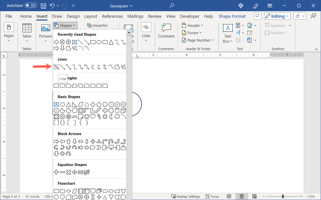 To get started, go to the Insert tab and open the Shapes drop-down menu. Select a shape such as a square for a male or circle for a female family member.