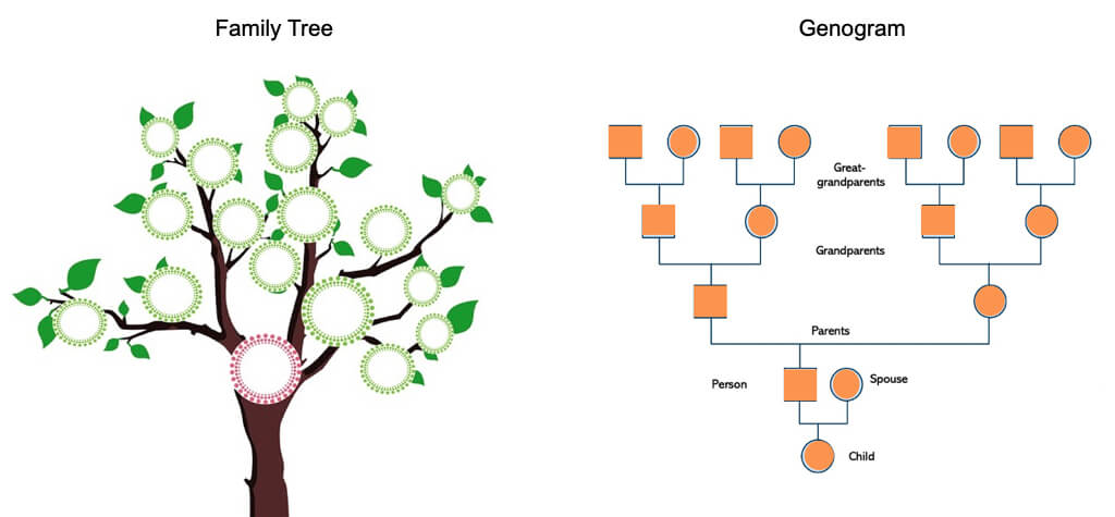 While similar to a family tree, a genogram goes into full details of your family members. It’s intended to display things like genders, ages, relationships, illnesses, and other elements you don’t normally find on a traditional family tree.