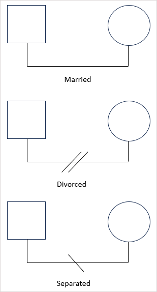 You can show a marriage, separation, and divorce with simple lines. Some genogram symbols go as far as displaying casual relationships, cohabitants, and relationships with conflicts such as violence, manipulation, and hostility.