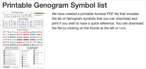 If you want to view all possible symbols, check out GenoPro’s printable symbol list. The downloadable PDF includes basic, emotional relationship, addiction, mental illness, and medical condition symbols.