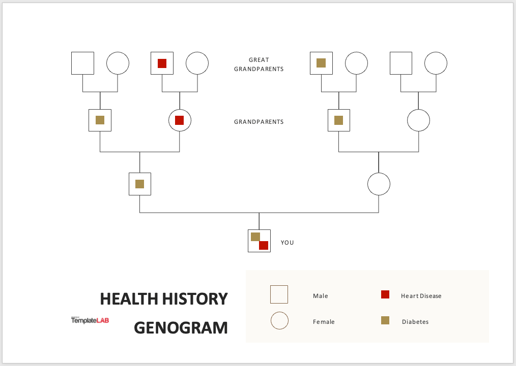 If it’s your family’s medical history you want for your genogram, this template from TemplateLab is ideal. The template uses colored indicators for heart disease and diabetes by default, but you can use those for whatever medical conditions you want to show.