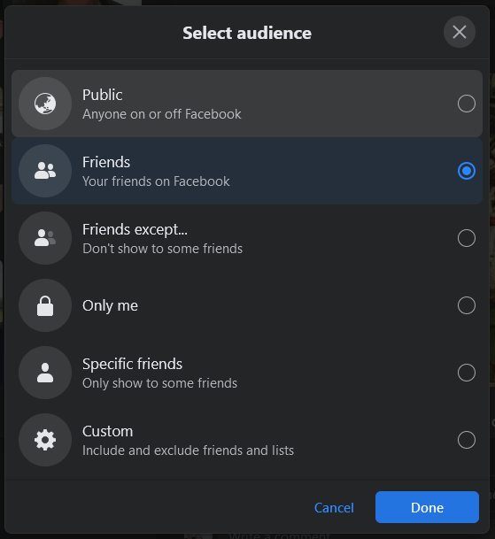 - Specific Friends. This option lets you choose certain people to share the post with.
