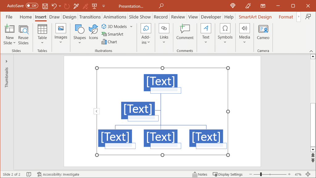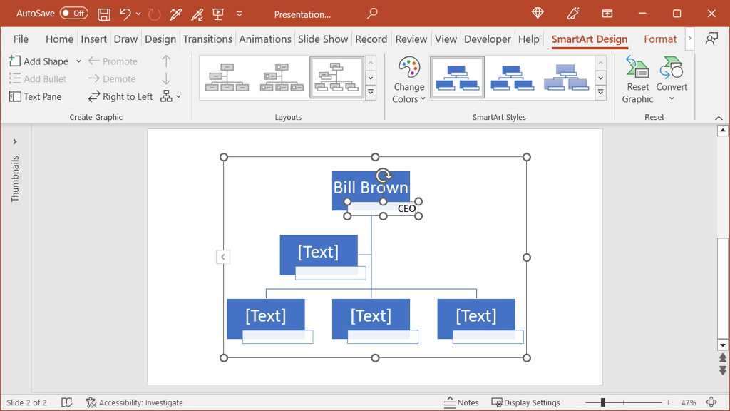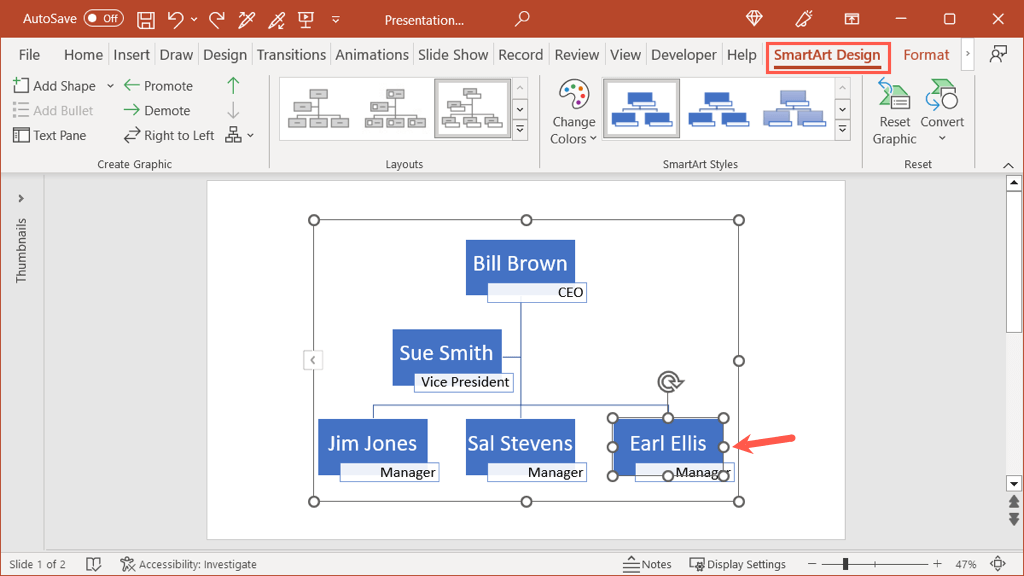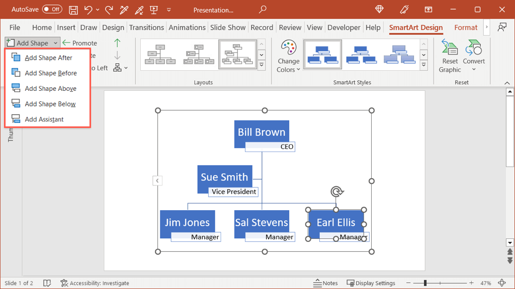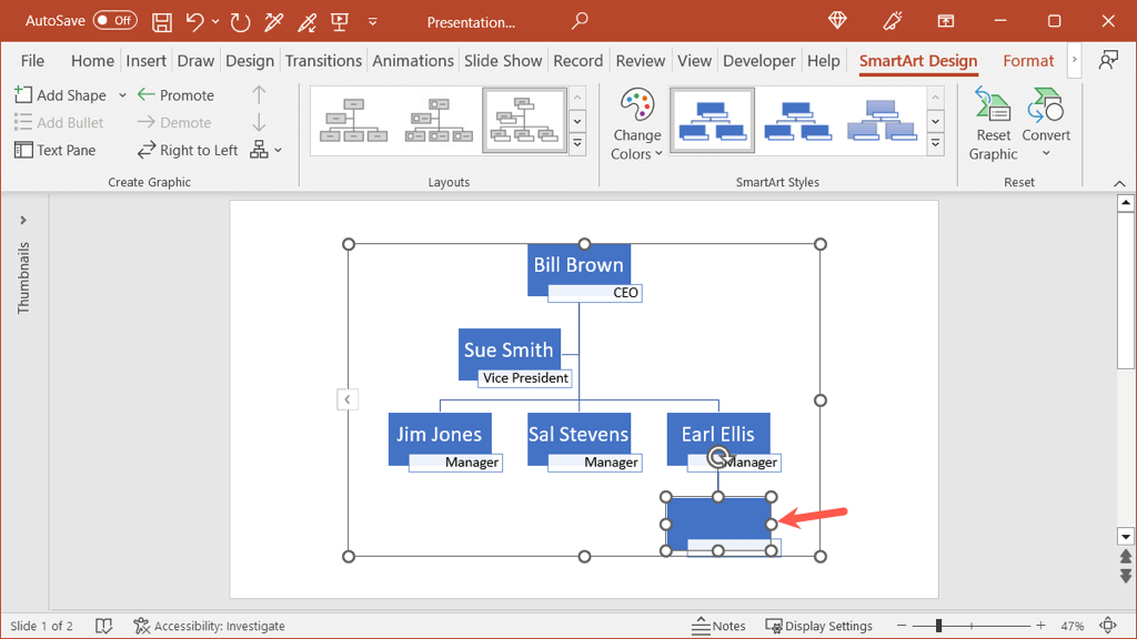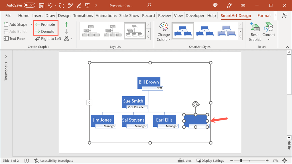 If you add a shape in a spot that you need to move, you don’t have to do this manually either. Select the shape, open the SmartArt Design tab and use the Promote or Demote button.