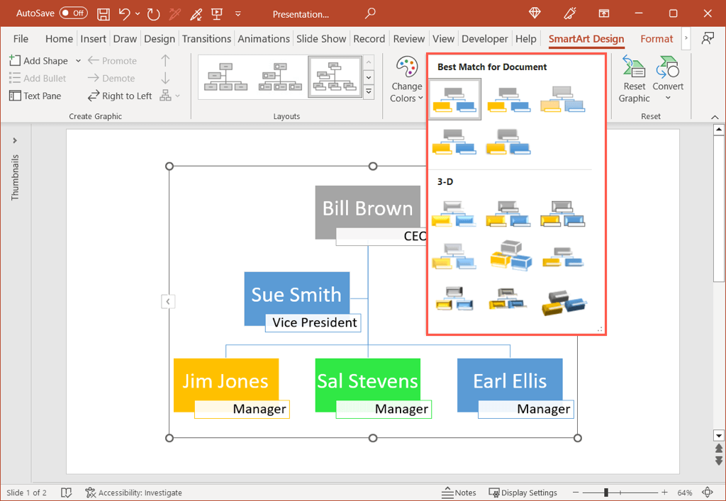Perhaps you have a unique chain of command or organizational structure for different departments. You can create an org chart from scratch using the SmartArt feature in Word, Excel, and PowerPoint.