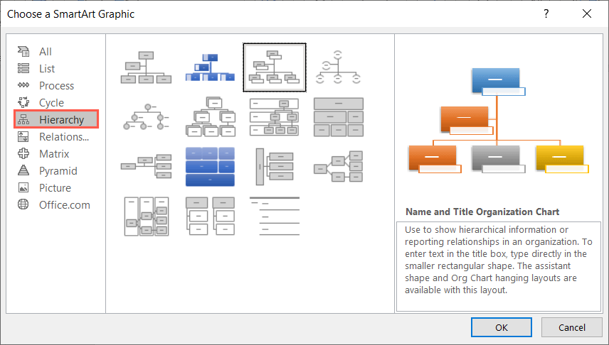 When the Choose a SmartArt Graphic box opens, choose Hierarchy on the left. You can then select each organizational chart option to see a preview and brief description on the right.
