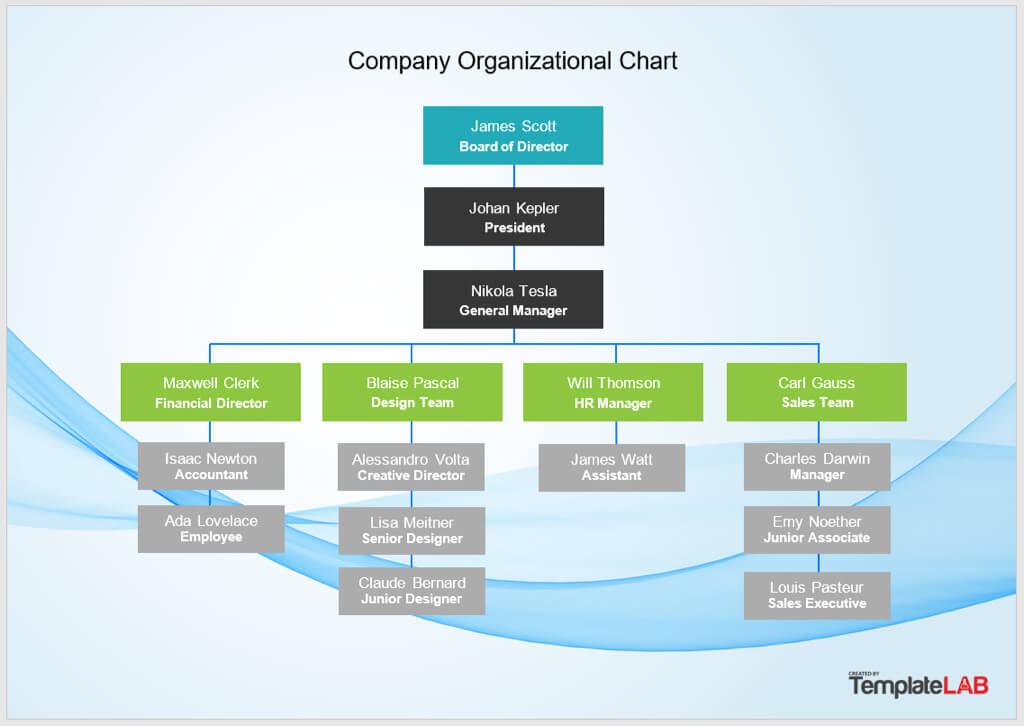 This first organizational chart template for Word gives you colorful text boxes on an attractive background. From TemplateLab, you can download the chart for free and just replace the sample names and titles with your own.