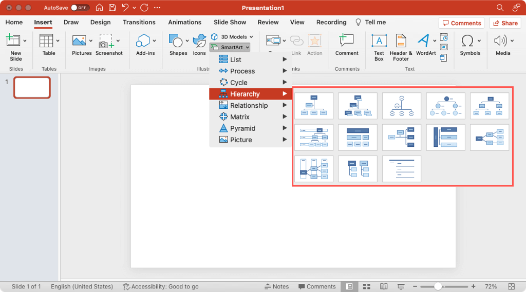 If you’re using a Mac, you can use the SmartArt drop-down menu and move to Hierarchy to pick the layout you want in the pop-out menu.
