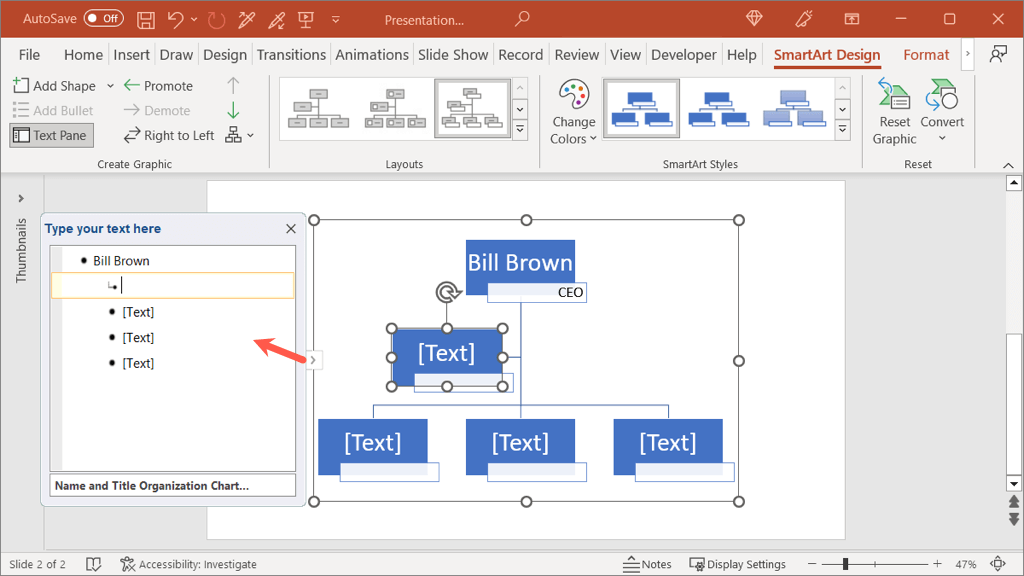 Alternatively, you can enter the details into the Text Pane. Select the arrow on the left side of the chart to open the panel. Then, choose a level and enter your text.