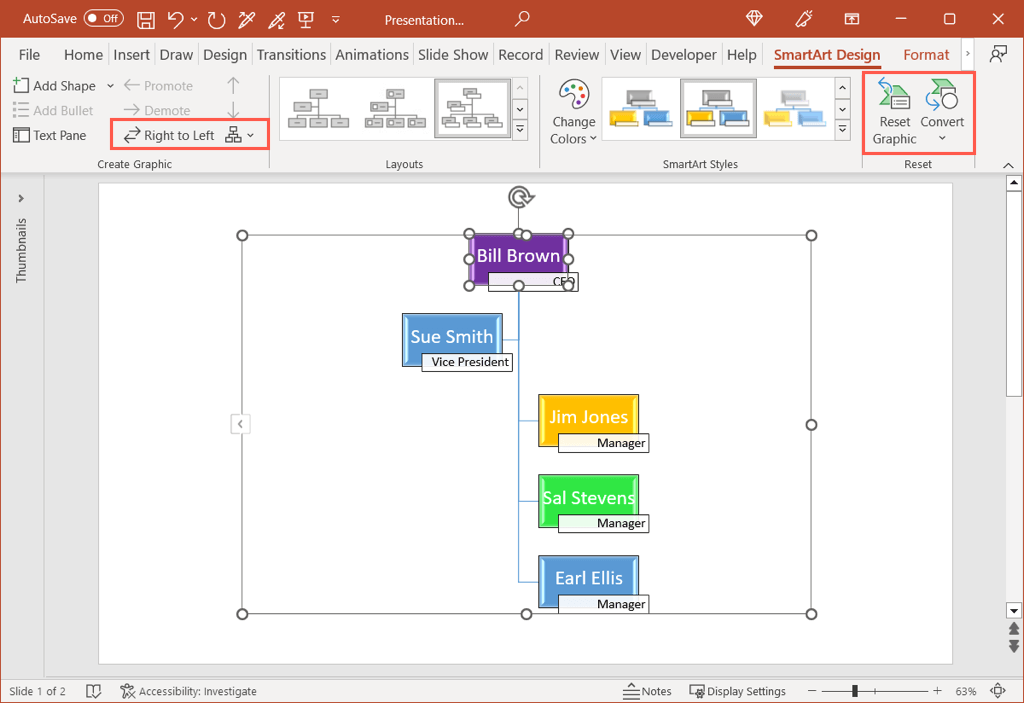 On the SmartArt Design tab, you’ll see actions to switch from left to right to right to left, change the chart layout, reset it to the default graphic, or convert the chart to text or simple shapes.
