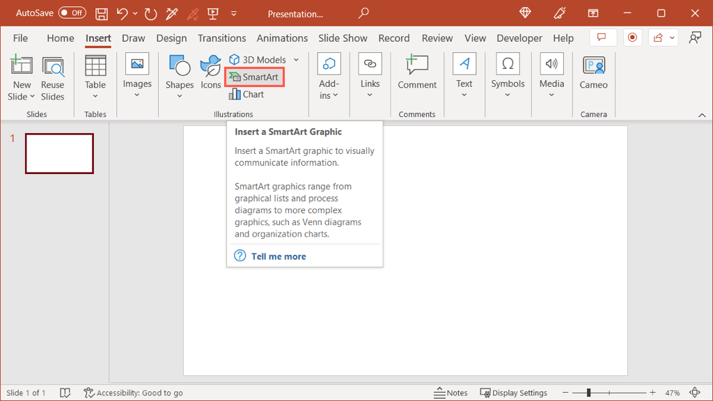 Head to the Insert tab and select SmartArt in the Illustrations section of the ribbon.