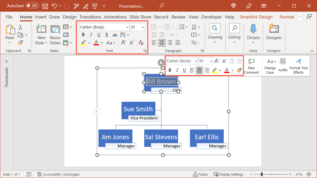If you prefer to use a different font style or color, select the text in a shape and use the floating toolbar or options in the Font group on the Home tab.