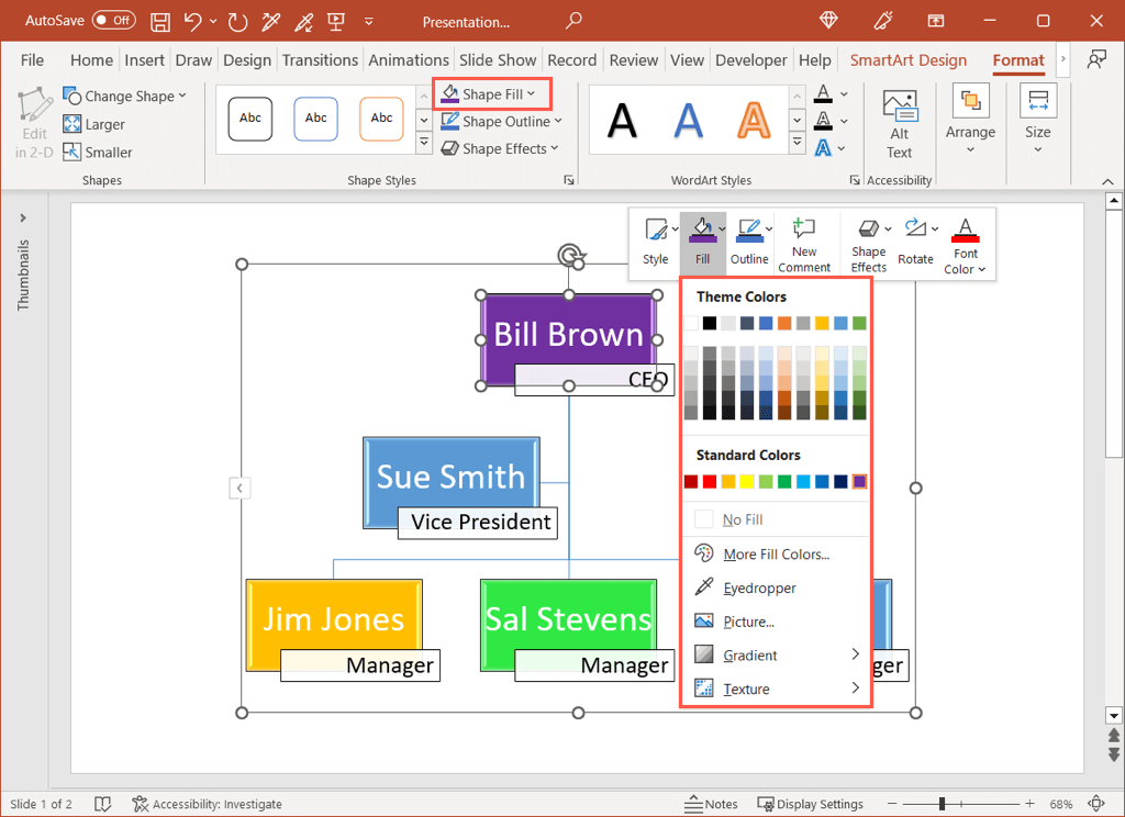 If you want to change a particular shape’s color rather than stick with a color scheme, you can do this as well. Either right-click the shape and use the Fill drop-down box in the floating toolbar or select the shape and use the Shape Fill option on the Format tab.
