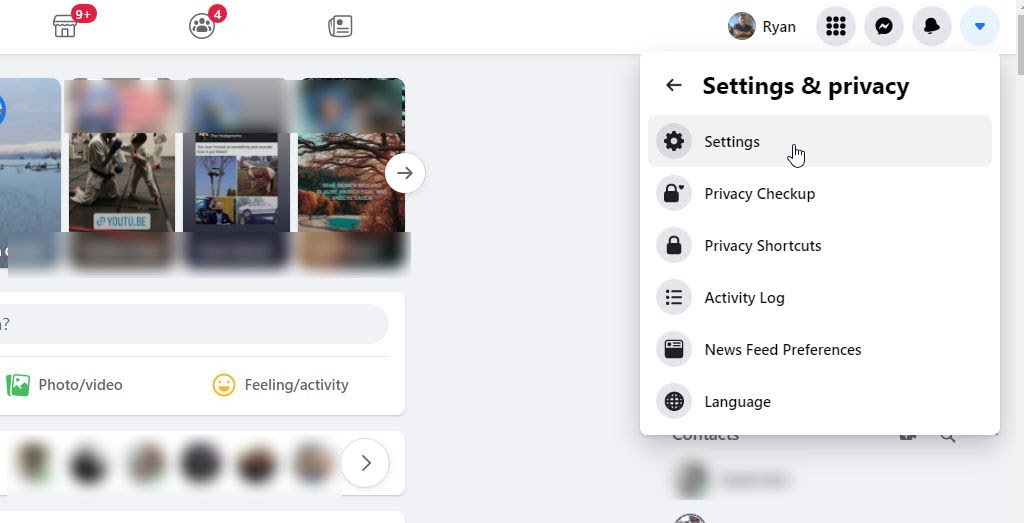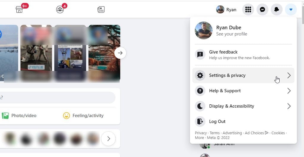 - Log into Facebook using the browser and select the dropdown arrow at the far right at the top of the page. Select Settings & privacy.