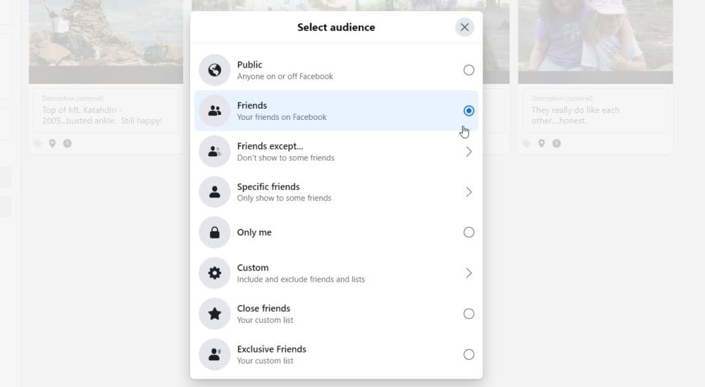 - Custom, Close friends, or Exclusive Friends: Customized lists where you can choose exactly who from your friends list gets to see the album and its photos.