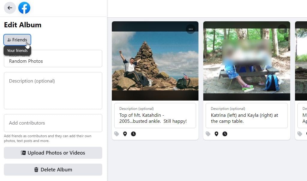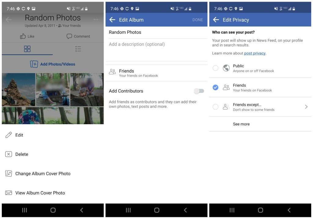- Friends, Friends except, or Specific Friends: Allow all or only some of your friends to see the album and all photos in it.