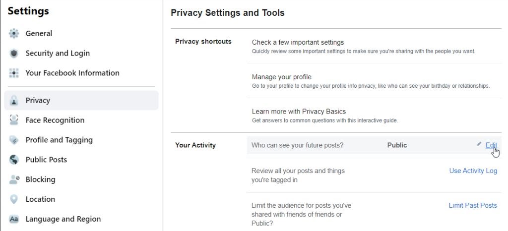 - On the privacy settings page, select **Privacy** in the left navigation pane. Find the Your Activity section on the right, and select **Edit** to the right of **Who can see your future posts**.