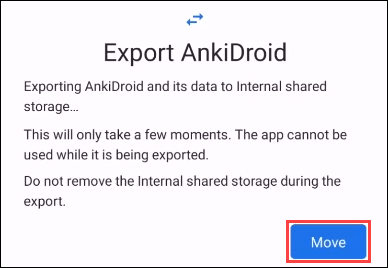 - A confirmation page will show, telling you to not use the app cannot or remove the Internal shared storage during the export. Select **Move**.