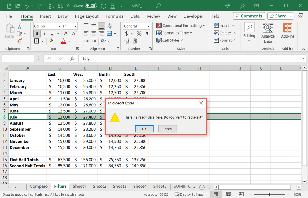 If you move a row to another row containing data, you’ll receive a pop-up message asking if you want to continue. If you want to replace the data, select OK, otherwise, choose Cancel and make room for the row you’re moving.