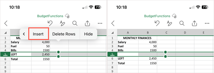 If you want to insert a blank row first, tap the row where you want one above and select Insert in the toolbar that appears.