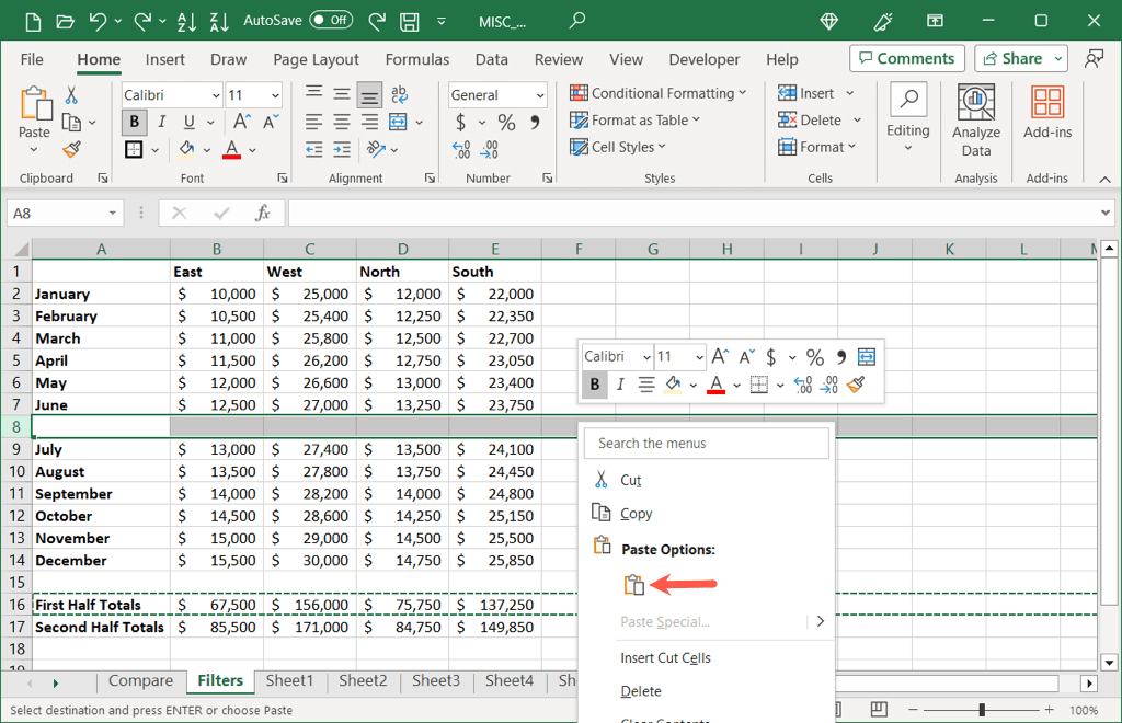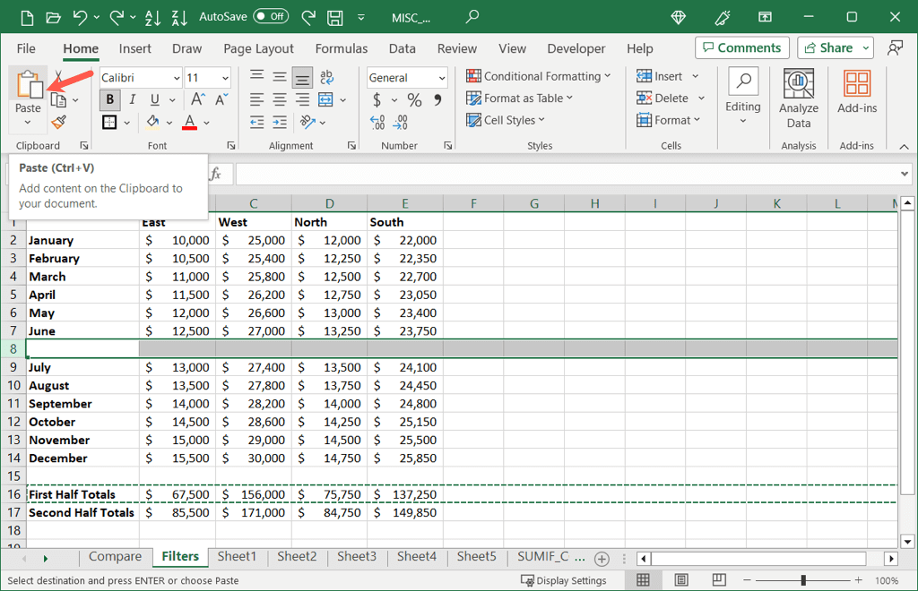 - Choose the row where you want to move the selected one, go to the Home tab, and pick Paste (clipboard button) in the Clipboard section.