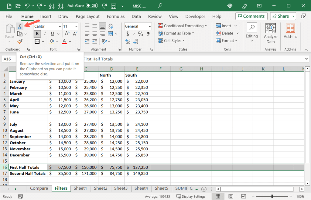 - Go to the Home tab and select Cut (scissors button) in the Clipboard section.